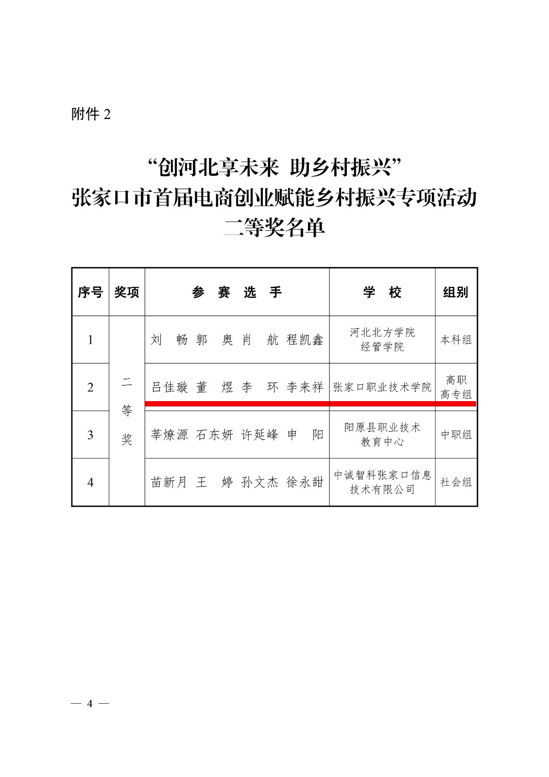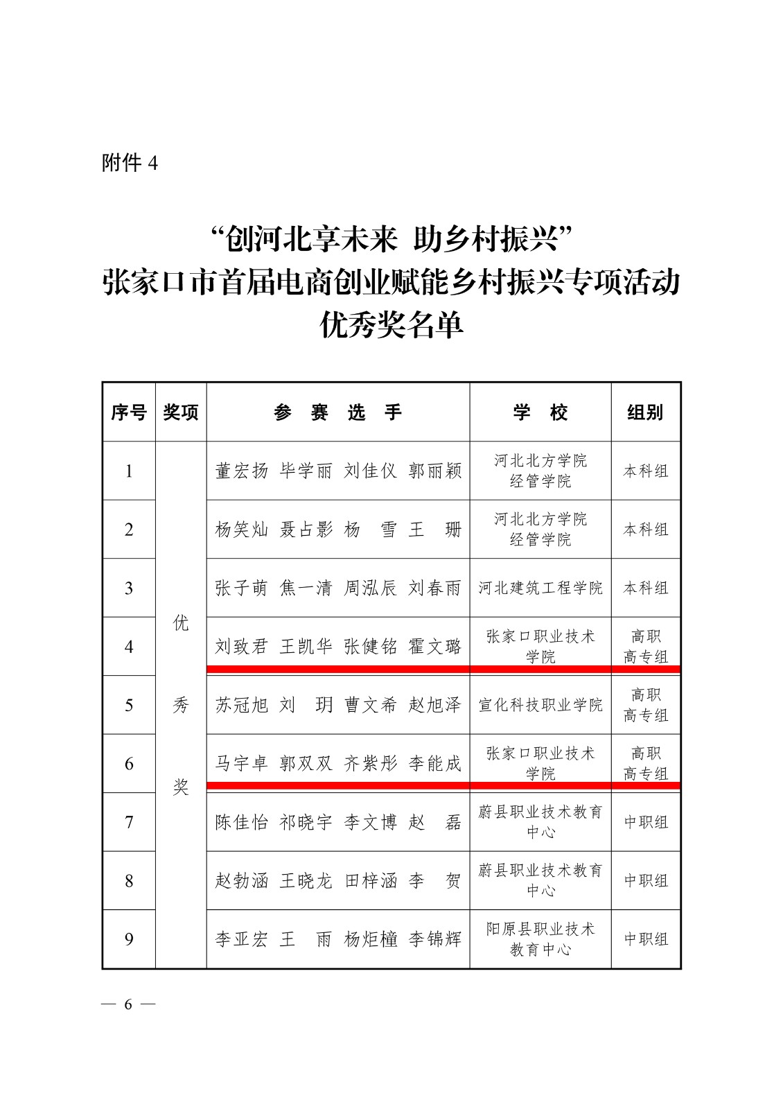 近日,河北省人力資源和社會(huì)保障廳、河北省鄉(xiāng)村振興局、張家口市人力資源和社會(huì)保障局公布了河北省第二屆“我為河北代言” 電商創(chuàng)業(yè)賦能鄉(xiāng)村振興大賽獲獎(jiǎng)名單和“創(chuàng)河北享未來(lái) 助鄉(xiāng)村振興” 張家口市首屆電商創(chuàng)業(yè)賦能鄉(xiāng)村振興專項(xiàng)活動(dòng)的獲獎(jiǎng)名單。我院獲得省賽三等獎(jiǎng)一項(xiàng),市賽一等獎(jiǎng)一項(xiàng)、二等獎(jiǎng)一項(xiàng)、優(yōu)秀獎(jiǎng)兩項(xiàng),優(yōu)秀指導(dǎo)教師四名。