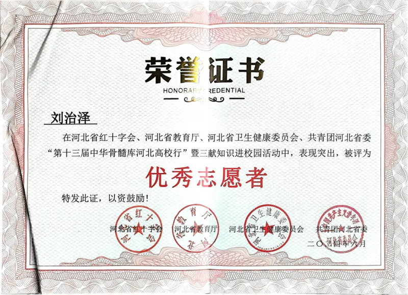 近日,在由河北省紅十字會、河北省教育廳、河北省衛(wèi)生健康委員會、共青團河北省委共同主辦的“第十三屆中華骨髓庫河北高校行”暨“三獻”知識進校園活動總結表揚大會落下帷幕。大會對“河北高校行”活動中優(yōu)秀志愿服務組織及優(yōu)秀志愿者進行表彰。我院校學生會主席劉治澤,青年志愿者服務隊隊長姚夢晗、副隊長袁聰聰榮獲“優(yōu)秀志愿者”榮譽稱號。