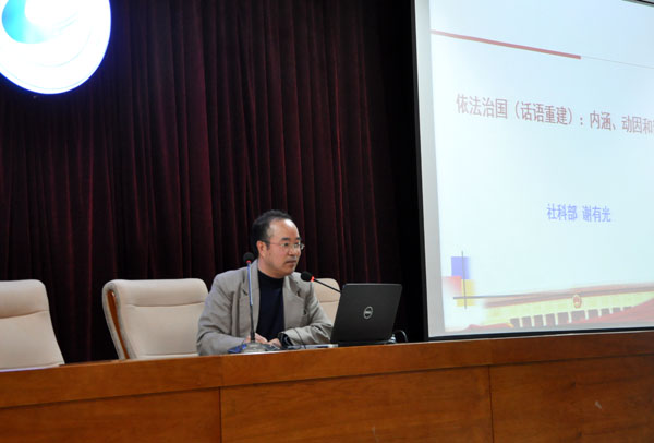 謝教授由如何理解和學習領會依法治國,進而延伸到實踐依法治校,并結合學院實際,分別從依法治校的內涵、依法治校的動因以及部署等方面進行了深入細致的闡述,通過對具體案例的分析,使與會人員能夠清楚地理解和領會依法治校的重要性和必要性。