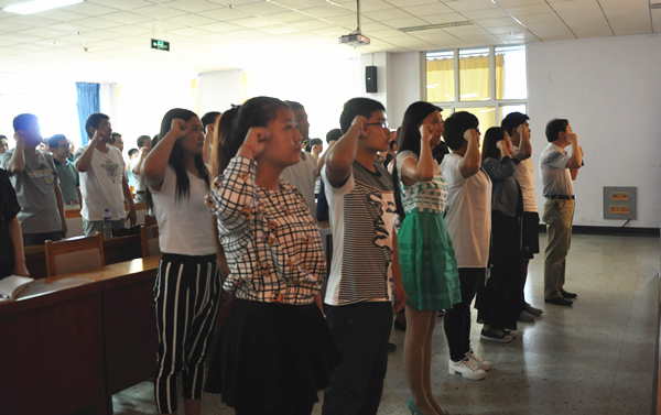 在對新黨章解讀之前,由白義教授領誓,新黨員代表和全體黨員一起面向黨旗,舉起右手莊嚴宣誓。新黨員入黨宣誓,老黨員重溫入黨誓詞,渾厚響亮的聲音,表達了共產黨人堅定的信念和必勝的決心。