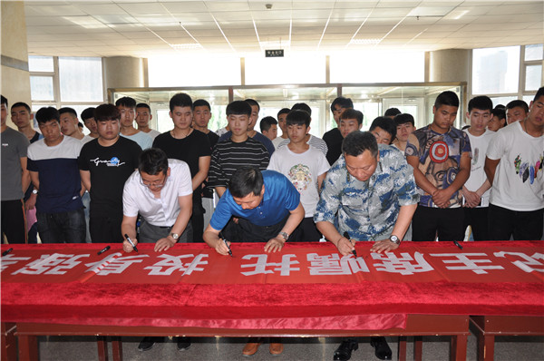 學院及武裝部領導分別在征兵條幅上簽名,并向學生們發放大學生應征入伍宣傳材料,解答學生們提出的應征入伍相關問題。