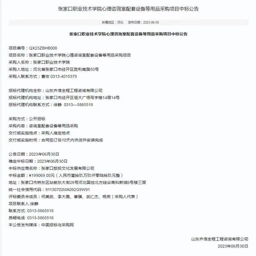 張家口職業技術學院心理咨詢室配套設備等用品采購項目中標公告