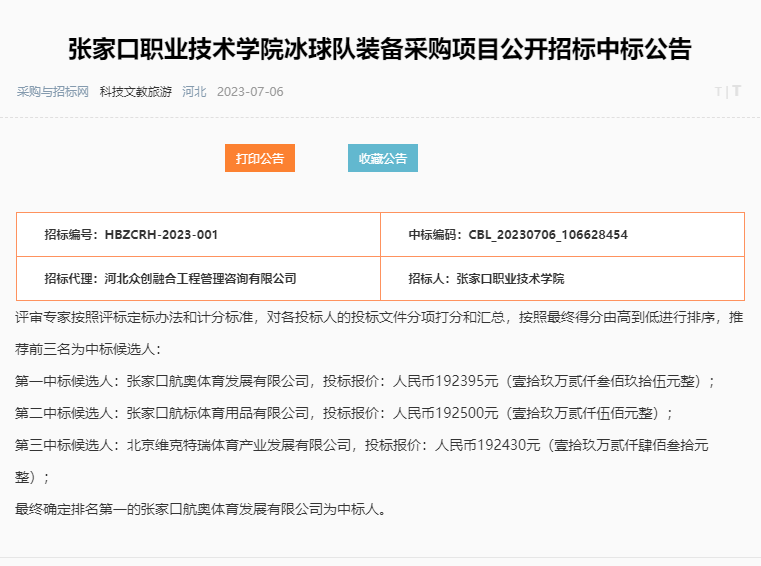 張家口職業技術學院冰球隊裝備采購項目公開招標中標公告