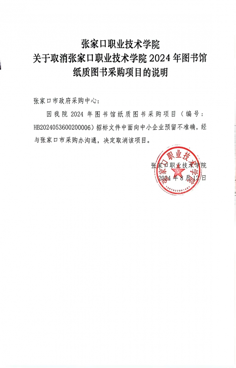 張家口職業(yè)技術(shù)學(xué)院2024年圖書館紙質(zhì)圖書采購項(xiàng)目廢標(biāo)公告