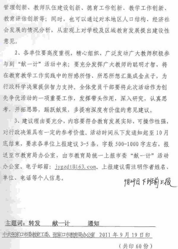1.各位教職工上報建議要按照市委通知規定的20項具體報送題目和市委教育工委、市教育局要求的上報建議內容組織稿件,可將教育教學工作實踐中的所感所悟、所思所想匯集成金點子,為行政科學決策提供智力支持。
