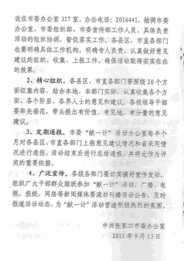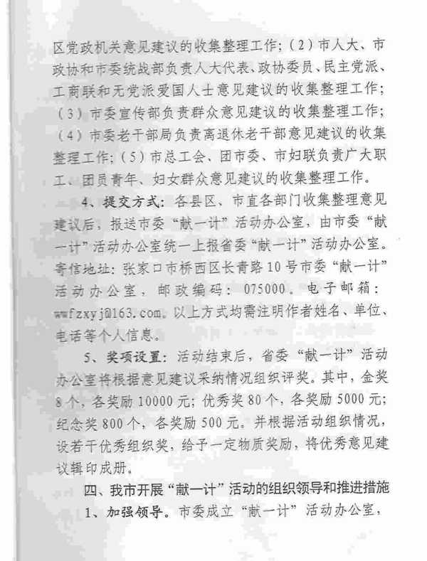 根據中共張家口市委辦公室《關于積極開展“迎接省第八次黨代會,我為河北發展獻一計”活動的通知》,按照市委教育工委、市教育局就開展這一活動的要求,我院將于從下發通知起至10月底在全院廣泛開展“獻一計”活動,吁請各位教職員工積極參與此次活動,深入研究,認真思考,開拓思路,踴躍獻策。具體要求如下: