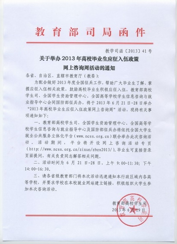 為配合做好2013年度征兵工作,幫助廣大畢業生了解、掌握應征入伍相關政策,鼓勵高校畢業生積極應征入伍,就業指導中心轉發教育部高校學生司關于舉辦2013年高校畢業生應征入伍政策網上咨詢周活動的通知,望各系盡快向學生傳達。