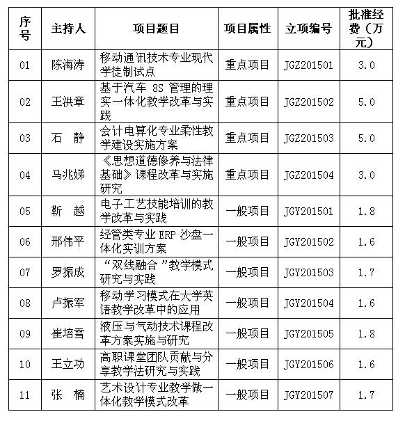 根據(jù)《張家口職業(yè)技術(shù)學院教學改革項目管理辦法(試行)》,通過組織專家評審、公示,現(xiàn)已確定11項教學改革項目予以立項,其中,重點項目4項,并給予一定的經(jīng)費支持。現(xiàn)將相關(guān)事宜通知如下: