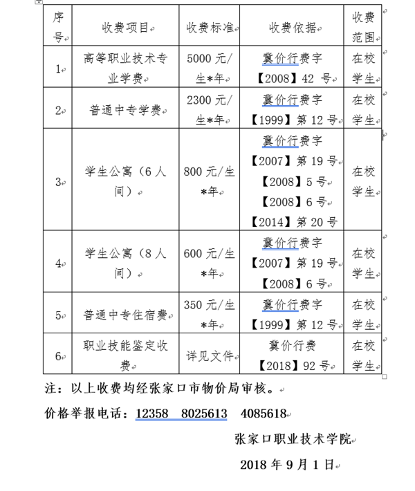 張家口職業技術學院教育收費公示