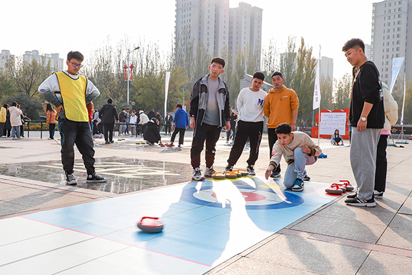 在旱地冰壺PK項目中,志愿者選手依次站在投壺區(qū)內(nèi),投擲隊員半彎身體,右手緊握冰壺手柄,讓冰壺依靠慣性滑向圓心,同時盡量將對方冰壺撞出。