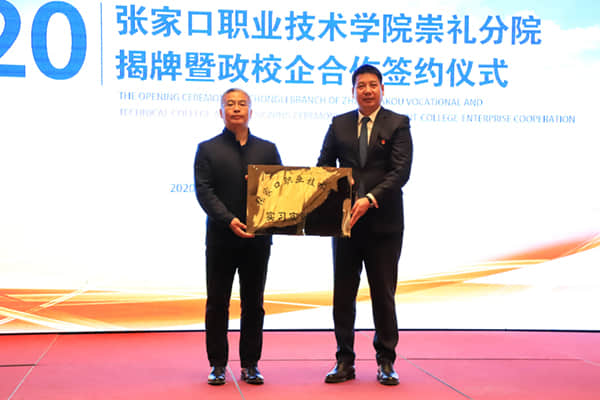 學院黨委副書記、院長王立軍為崇禮區副區長、崇禮分院院長馮莉群,學院經濟管理系黨總支書記、主任、崇禮分院副院長崔健,學院應用外語系黨總支書記、主任、崇禮分院副院長張曉鵬,崇禮區職教中心校長、崇禮分院副院長馬偉龍頒發聘書;為富龍控股有限公司授張家口職業技術學院實習實訓基地牌匾。