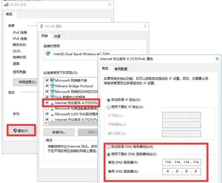 依次打開,控制面板-網絡和internet-網絡和共享中心,點擊左側的更改適配器設置,找到當前使用的網卡,右鍵屬性,如下圖手動填寫DNS,常用免費的DNS有谷歌的8.8.8.8/8.8.6.6,114DNS的114.114.114.114/114.114.115.115等。