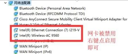 1.打開設備管理器,找到網絡適配器,如果被禁用,右鍵啟用即可。