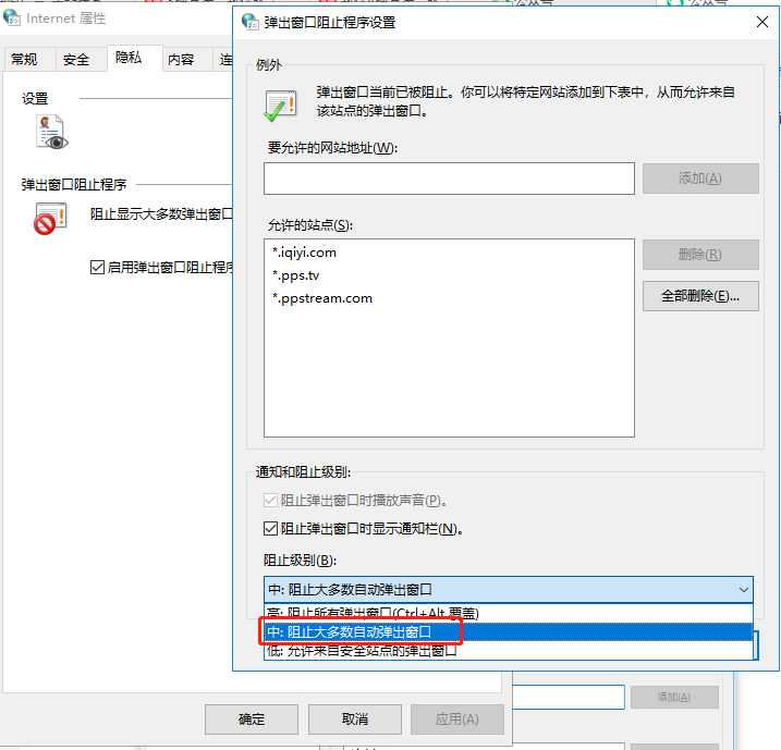 再進入下一步【設置】中,將【通知和阻止級別】調整成【阻止絕大多數(shù)彈窗】,最后點擊右下角確定按鈕,這樣就可以阻止彈窗廣告了。